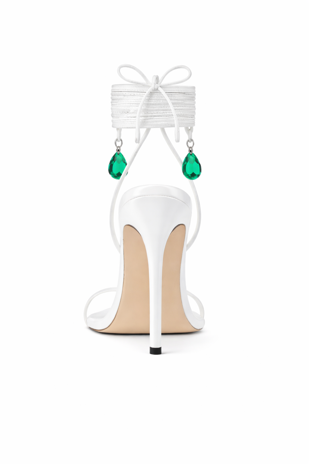 A refined pointed sandal crafted in smooth white with a delicate toe strap and sculpted stiletto heel. The wrapped ankle ties elegantly and is finished with two emerald crystal pendants for a luminous touch. Designed for statement evenings and elevated occasions.